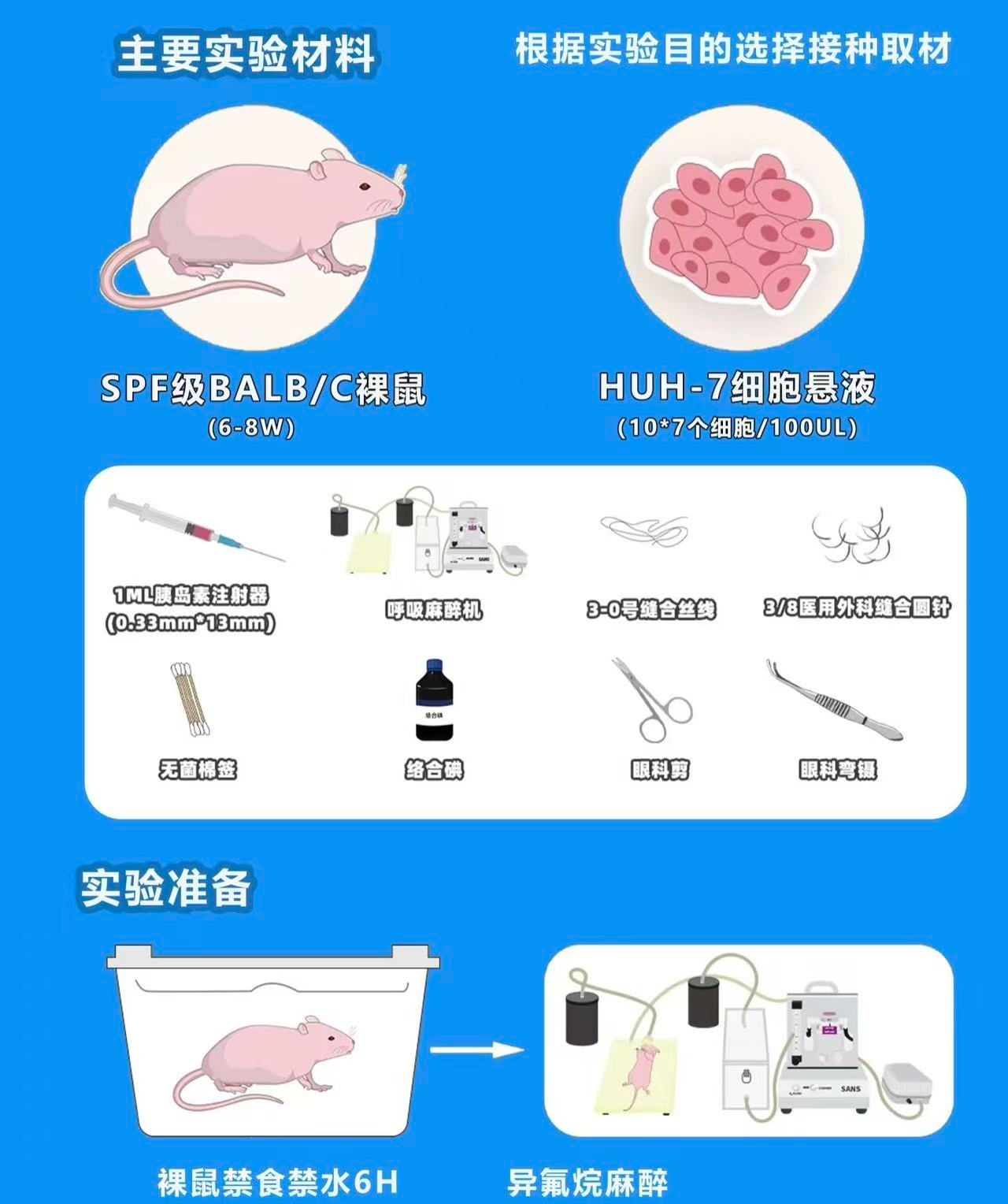 裸鼠肝原位成瘤是一种常用的肿瘤研究模型,通过将人肝癌细胞或组织直接移植到裸鼠肝脏中,模拟人类肝癌的生长和转移过程。以下是该模型的主要步骤和要点:
