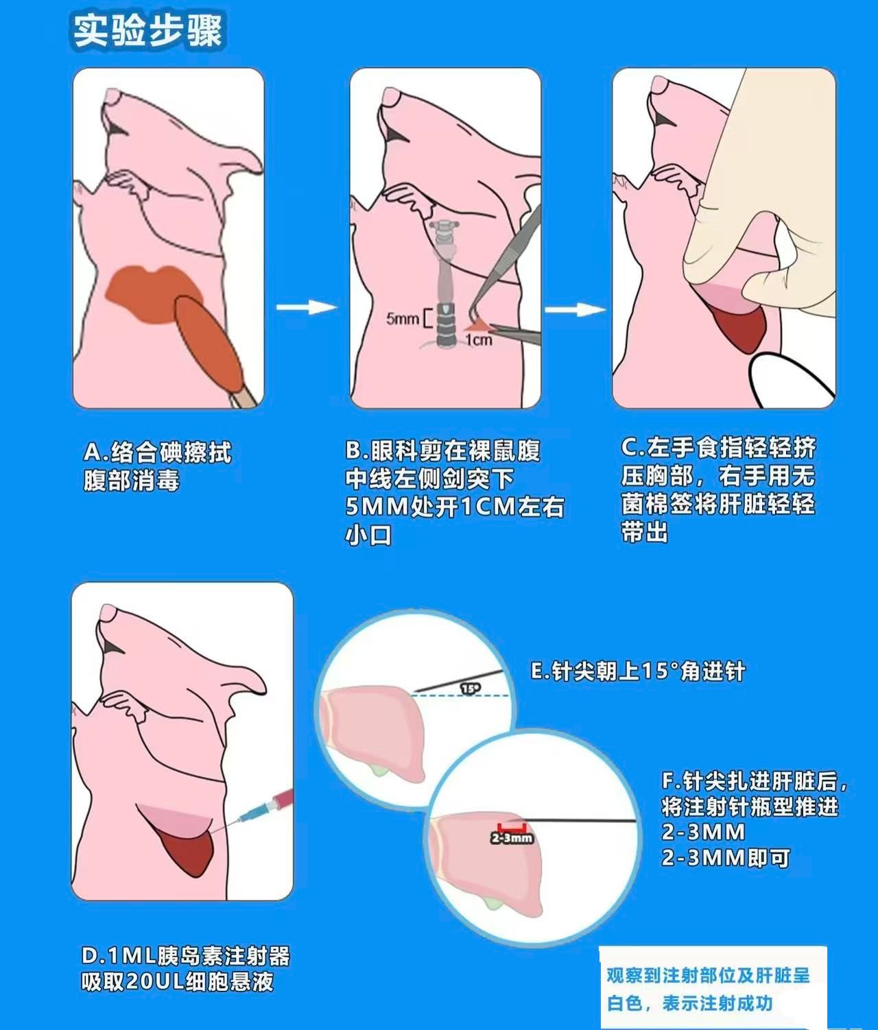 n 细胞悬液注射法:用微量注射器将细胞悬液(如20μL,含2×10^6个细胞)直接注射到肝脏左叶或右叶实质内,注意避免大血管。