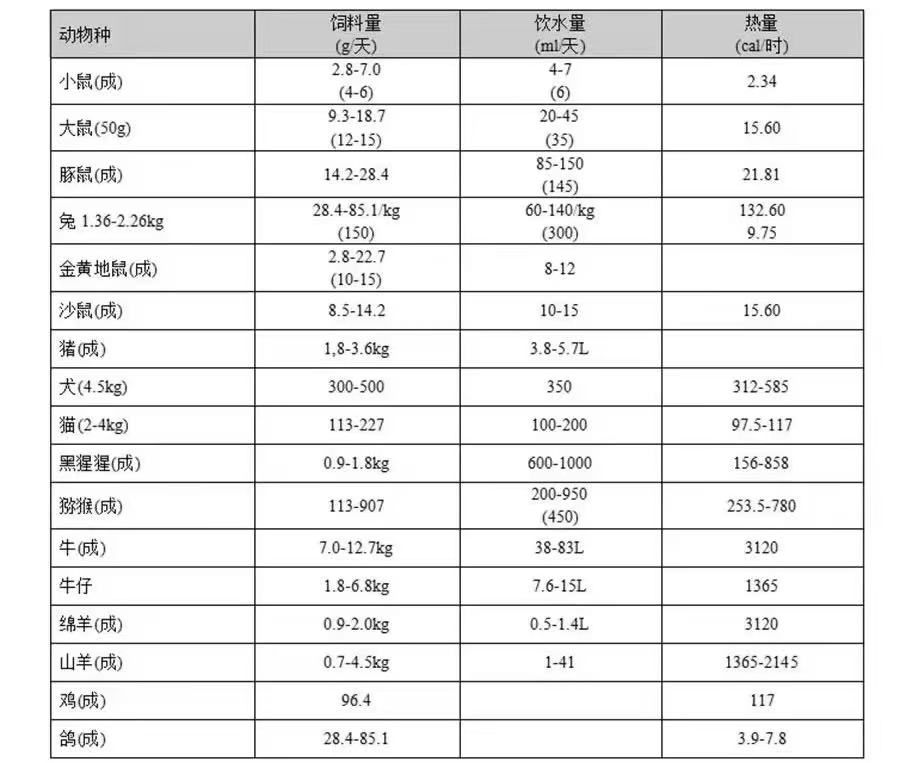 常用实验动物饲料量、饮水量、产热量表